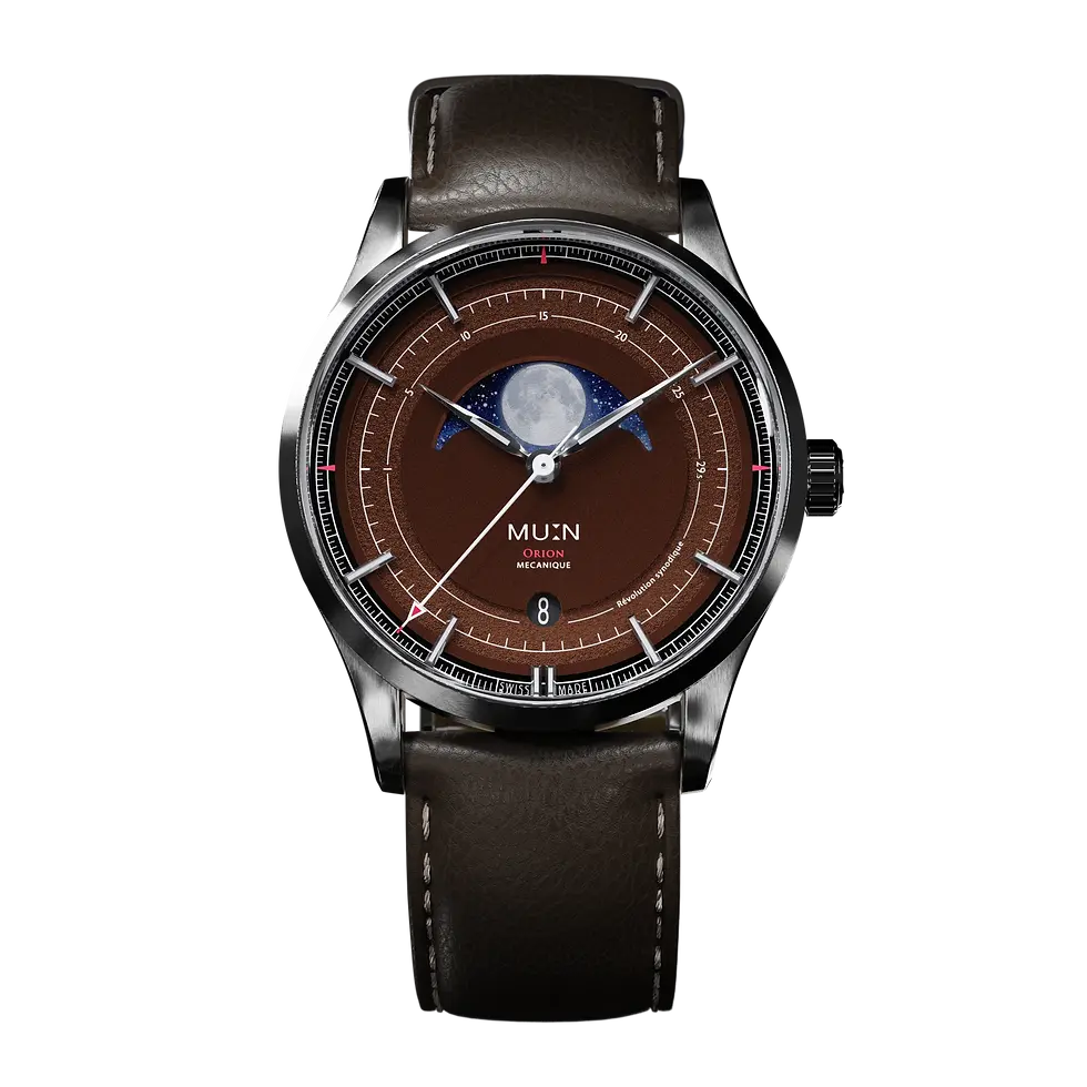 Orion Brown s'habille de couleurs Terre, point d’ancrage de toute exploration spatiale. Ce modèle célèbre notre planète, par un cadran étagé aux nuances organiques et cuivrées.